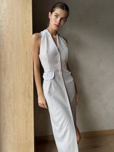 Легкое платье-сарафан с белым воротничком через шею и открытой спиной. Украшено контрастными жемчужными пуговицами и декоративными карманами-клапанами.